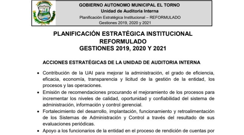 Leer másPLANIFICACIÓN ESTRATÉGICA INSTITUCIONAL REFORMULADO GESTIONES 2019, 2020 Y 2021 ACCIONES ESTRATÉGICAS DE LA UNIDAD DE AUDITORIA INTERNA Contribución de