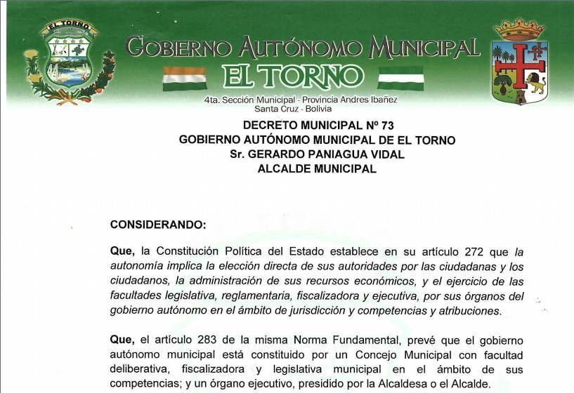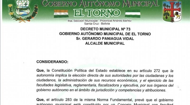 DECRETO MUNICIPAL N° 73 FUNCIONAMIENTO DEL MERCADO MUNICIPAL EL TORNO
