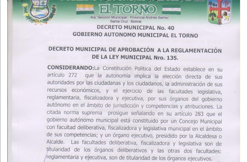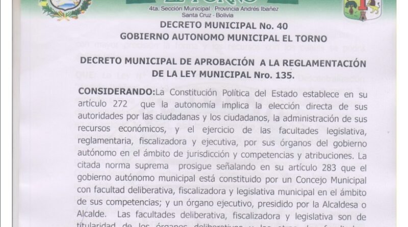 DECRETO MUNICIPAL No. 40 GOBIERNO AUTONOMO MUNICIPAL EL TORNO DECRETO MUNICIPAL DE APROBACIÓN A LA REGLAMENTACIÓN DE LA LEY MUNICIPAL Nro. 135.