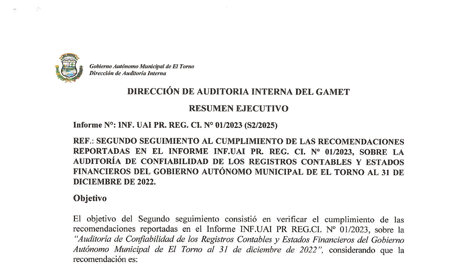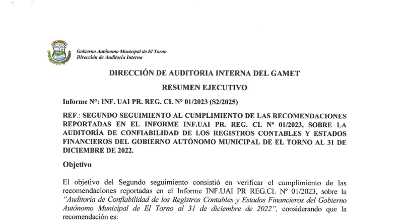 El objetivo del Segundo seguimiento consistió en verificar el cumplimiento de las recomendaciones reportadas en el Informe INF.UAI PR REG.CI. N° 01/2023, sobre la «Auditoría de Confiabilidad de los Registros Contables y Estados Financieros del Gobierno Autónomo Municipal de El Torno al 31 de diciembre de 2022», considerando que la recomendación es: