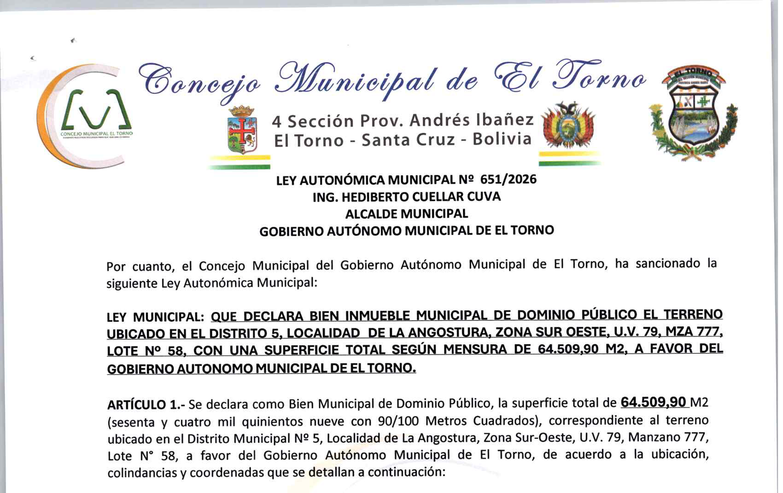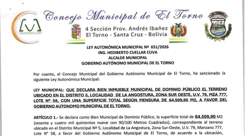 LEY MUNICIPAL: QUE DECLARA BIEN INMUEBLE MUNICIPAL DE DOMINIO PÚBLICO EL TERRENO UBICADO EN EL DISTRITO 5, LOCALIDAD DE LA ANGOSTURA, ZONA SUR OESTE, U.V. 79, MZA 777, LOTE N° 58, CON UNA SUPERFICIE TOTAL SEGÚN MENSURA DE 64.509,90 M2, A FAVOR DEL GOBIERNO AUTONOMO MUNICIPAL DE EL TORNO.