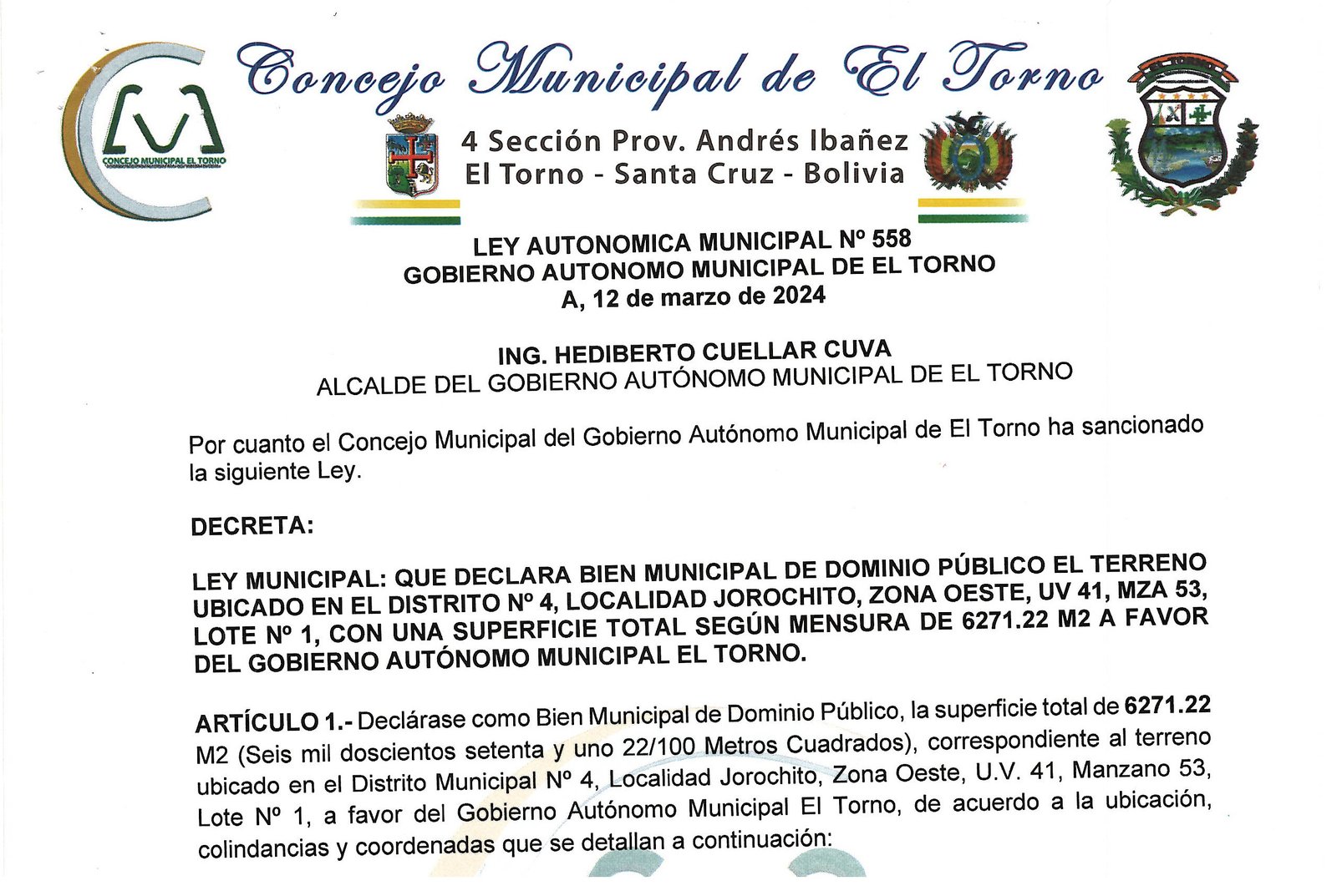 LEY MUNICIPAL: QUE DECLARA BIEN MUNICIPAL DE DOMINIO PÚBLICO EL TERRENO UBICADO EN DISTRITO N°4, LOCALIDAD JOROCHITO, ZONA OESTE, UV 41,MZA 53, LOTE N°1, CON UNA SUPERFICIE TOTAL SEGÚN MENSURA DE 6271.22 M2 A FAVOR DEL GOBIERNO AUTÓNOMO MUNICIPAL EL TORNO.