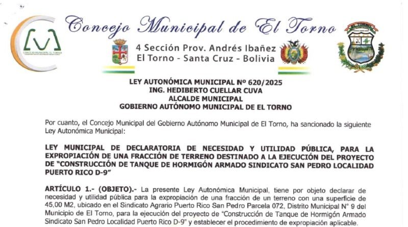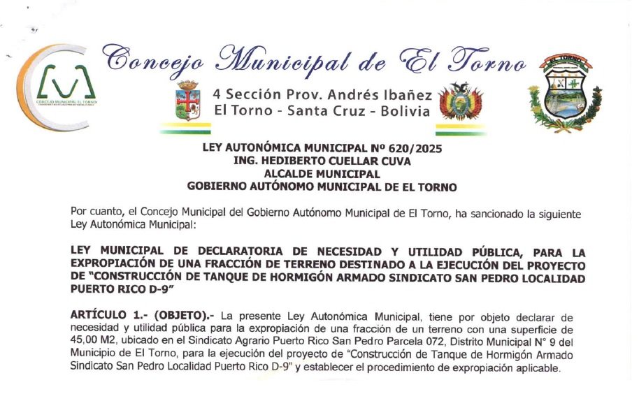 LEY MUNICIPAL DE DECLARATORIA DE NECESIDAD Y UTILIDAD PÚBLICA, PARA LA EXPROPIACIÓN DE UNA FRACCIÓN DE TERRENO DESTINADO A LA EJECUCIÓN DEL PROYECTO DE «CONSTRUCCIÓN DE TANQUE DE HORMIGÓN ARMADO SINDICATO SAN PEDRO LOCALIDAD PUERTO RICO D-9»