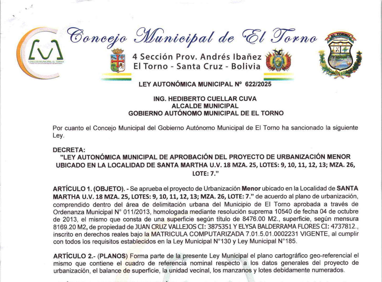 «LEY AUTONÓMICA MUNICIPAL DE APROBACIÓN DEL PROYECTO DE URBANIZACIÓN MENOR UBICADO EN LA LOCALIDAD DE SANTA MARTHA U.V. 18 MZA. 25, LOTES: 9, 10, 11, 12, 13; MZA. 26, LOTE: 7.»