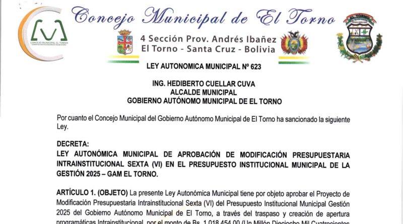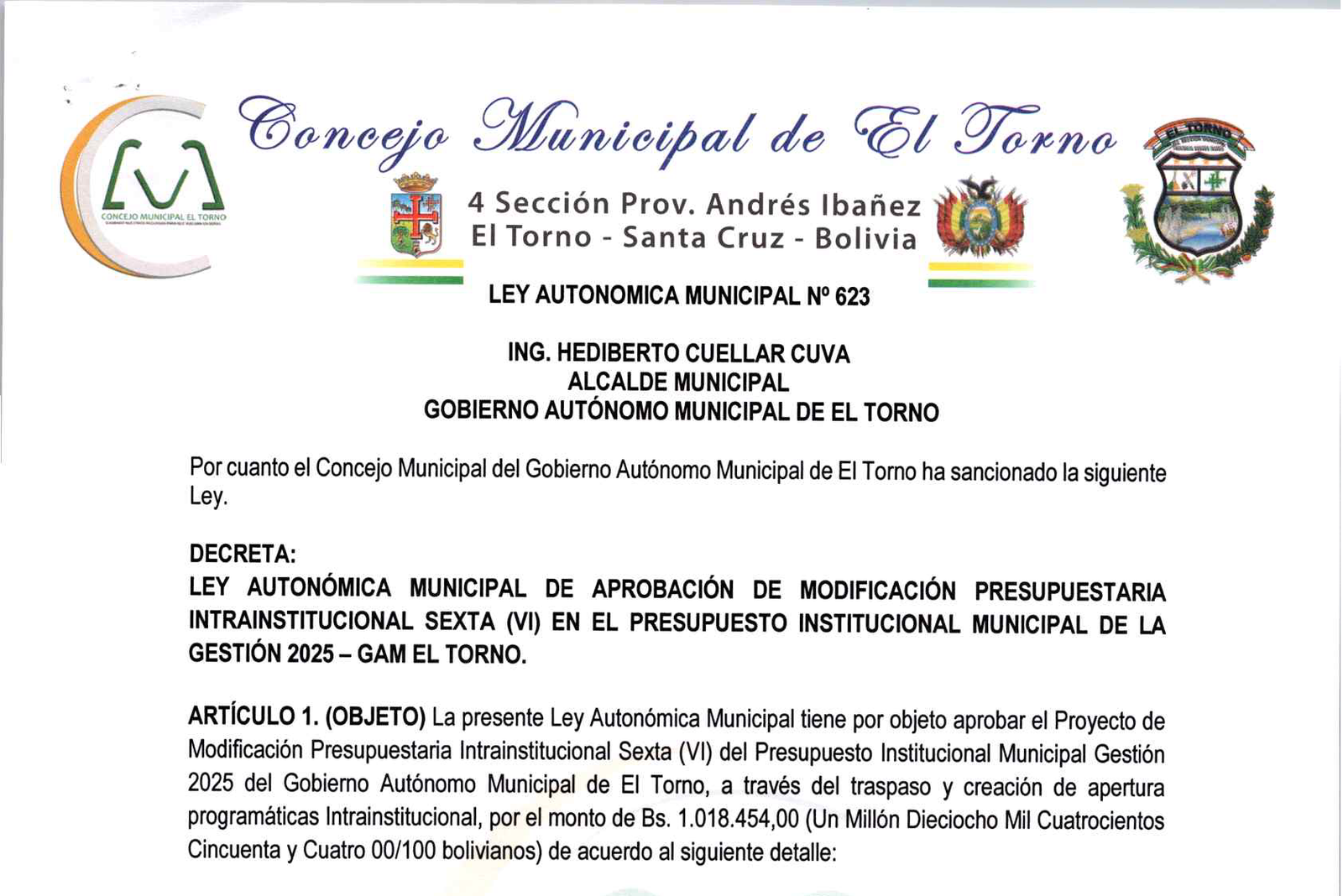 LEY AUTONÓMICA MUNICIPAL DE APROBACIÓN DE MODIFICACIÓN PRESUPESTARIA INSTRAINSTITUCIONAL SEXTA (VI) EN EL PRESUPUESTO INSTITUCIONAL MUNICIPAL DE LA GESTION 2025 – GAM EL TORNO