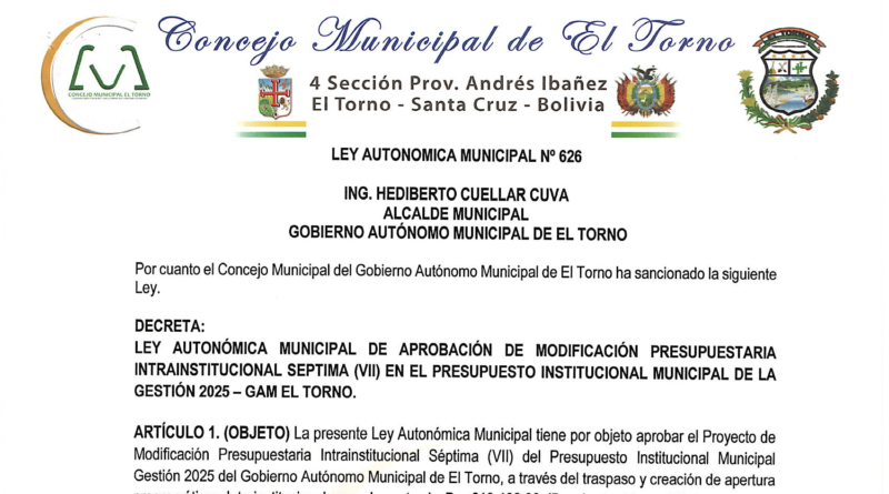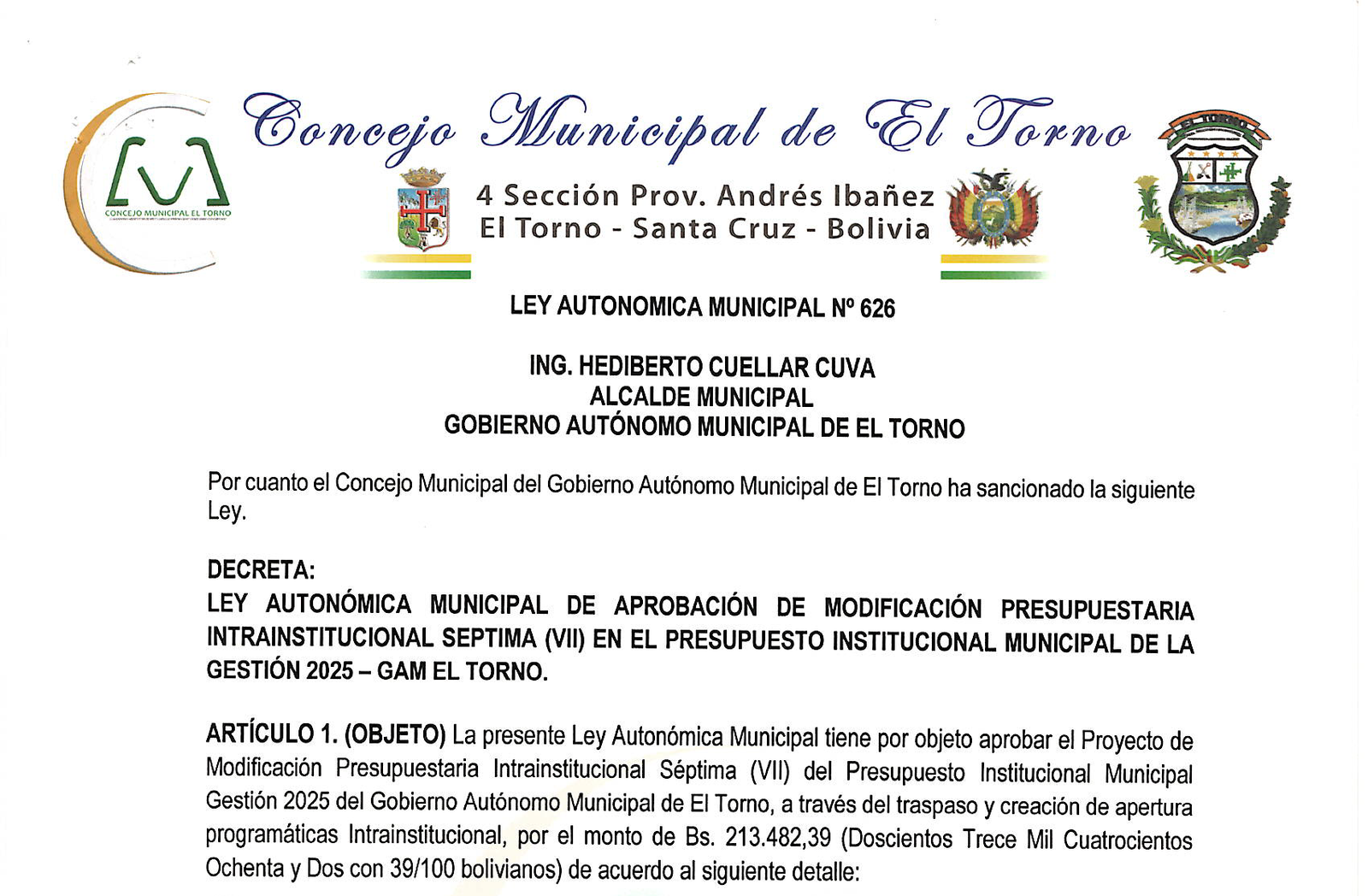 LEY AUTONÓMICA MINICIPAL DE APROBACIÓN DE MODIFICACION PRESUPUESTARIA INTRAINSTITUCIONAL SEPTIMA (VII) EN EL PRESUPUESTO INSTITUCIONAL MUNICIPAL DE LA GESTIÓN 2025 – GAM EL TORNO