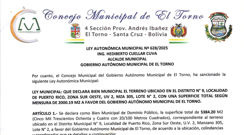 LEY MUNICIPAL: QUE DECLARA BIEN MUNICIPAL EL TERRENO UBICADO EN EL DISTRITO N° 9, LOCALIDAD DE PUERTO RICO, ZONA SUR OESTE, UV 2, MZA 305, LOTE N° 2, CON UNA SUPERFICIE TOTAL SEGÚN MENSURA DE 2000.19 M2 A FAVOR DEL GOBIERNO AUTÓNOMO MUNICIPAL DE EL TORNO.