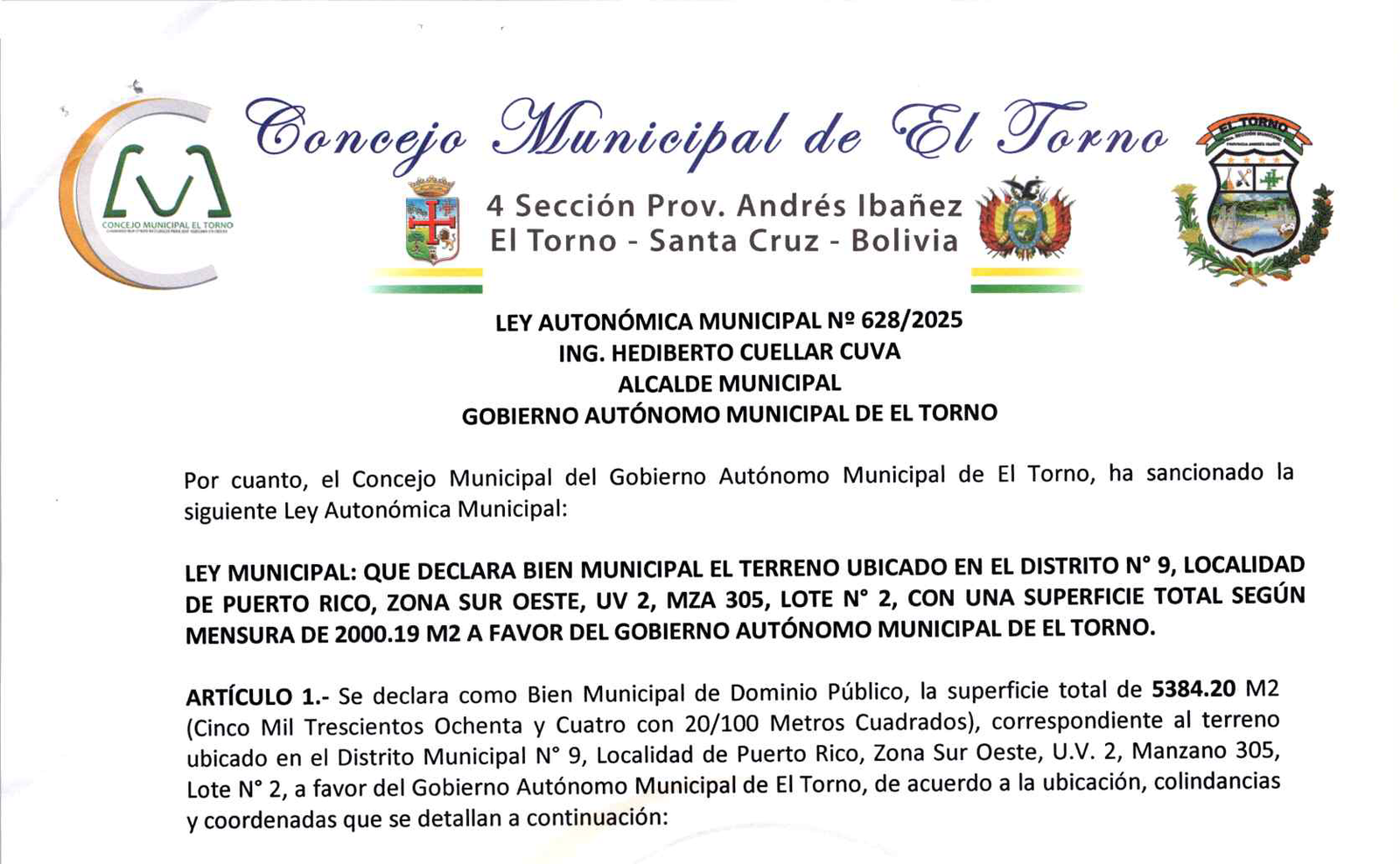 LEY MUNICIPAL: QUE DECLARA BIEN MUNICIPAL EL TERRENO UBICADO EN EL DISTRITO N° 9, LOCALIDAD DE PUERTO RICO, ZONA SUR OESTE, UV 2, MZA 305, LOTE N° 2, CON UNA SUPERFICIE TOTAL SEGÚN MENSURA DE 2000.19 M2 A FAVOR DEL GOBIERNO AUTÓNOMO MUNICIPAL DE EL TORNO.