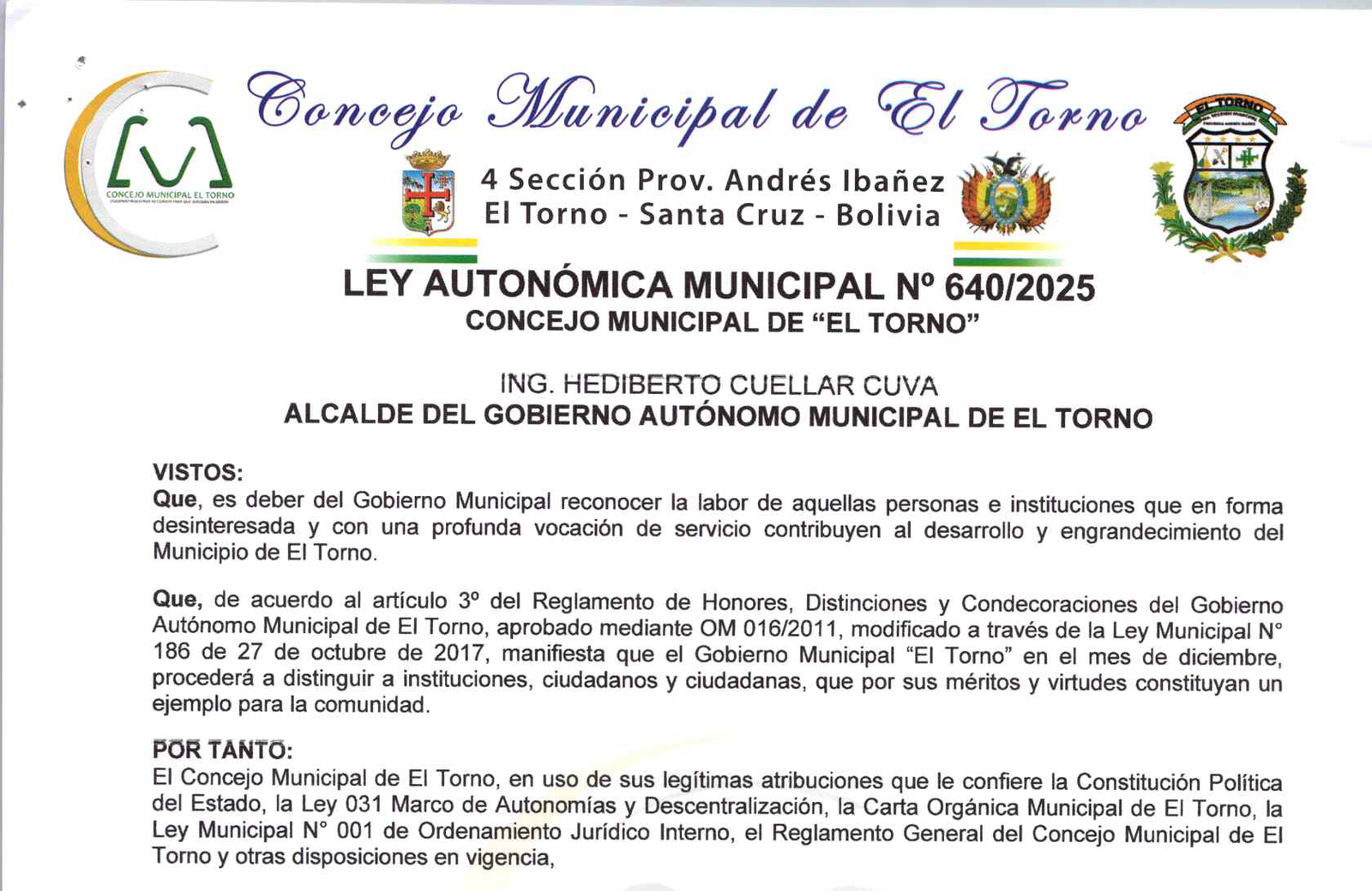 El Concejo Municipal de El Torno, en uso de sus legítimas atribuciones que le confiere la Constitución Política del Estado, la Ley 031 Marco de Autonomías y Descentralización, la Carta Orgánica Municipal de El Torno, la Ley Municipal N° 001 de Ordenamiento Jurídico Interno, el Reglamento General del Concejo Municipal de El Torno y otras disposiciones en vigencia,