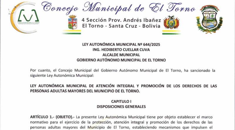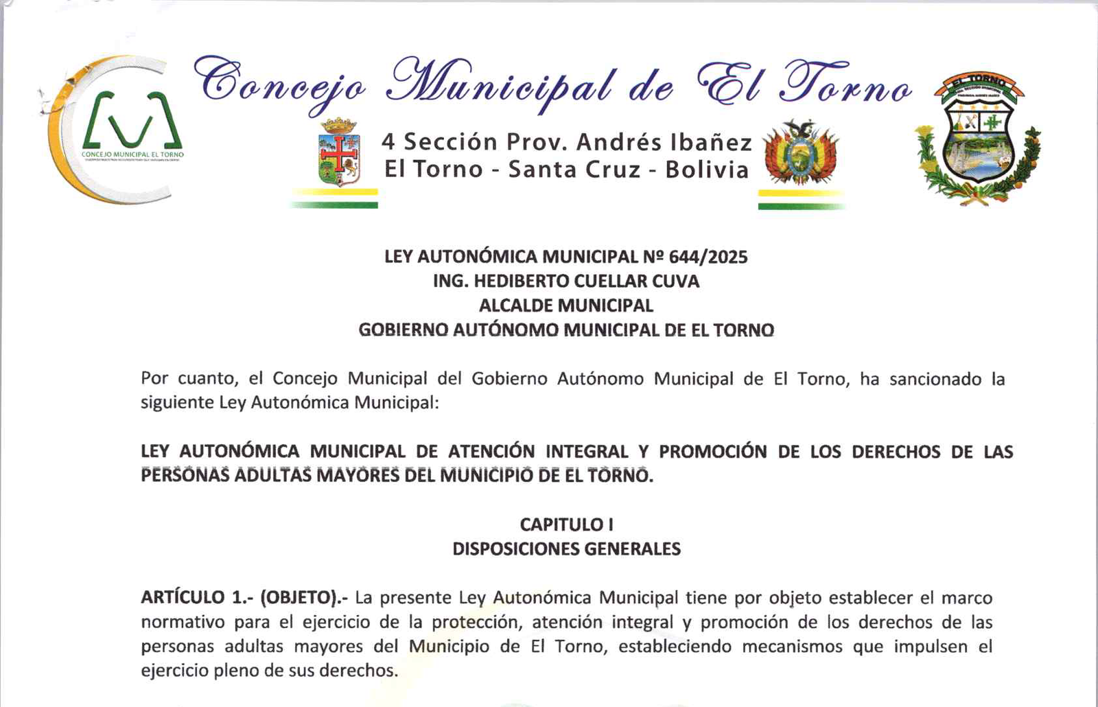 ARTÍCULO 1.- (OBJETO).- La presente Ley Autonómica Municipal tiene por objeto establecer el marco normativo para el ejercicio de la protección, atención integral y promoción de los derechos de las personas adultas mayores del Municipio de El Torno, estableciendo mecanismos que impulsen el ejercicio pleno de sus derechos.