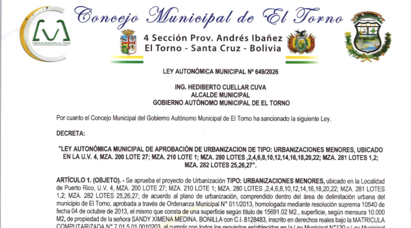 ARTÍCULO 1. (OBJETO). – Se aprueba el proyecto de Urbanización TIPO: URBANIZACIONES MENORES, ubicado en la Localidad de Puerto Rico, U.V. 4, MZA. 200 LOTE 27; MZA. 210 LOTE 1; MZA. 280 LOTES,2,4,6,8,10,12,14,16,18,20,22; MZA. 281 LOTES 1,2; MZA. 282 LOTES 25,26,27; de acuerdo al plano de urbanización, comprendido dentro del área de delimitación urbana del municipio de El Torno, aprobada a través de Ordenanza Municipal N° 011/2013, homologada mediante resolución suprema 10540 de fecha 04 de octubre de 2013, el mismo que consta de una superficie según título de 15691.02 M2., superficie, según mensura 10.000 M2,