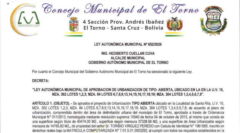 «LEY AUTONÓMICA MUNICIPAL DE APROBACION DE URBANIZACION DE TIPO: ABIERTA, UBICADO EN LA EN LA U.V. 10, MZA. 302 LOTES 1,2,3; MZA. 84 LOTES 6,7,8,9,13,14,15,16,17,18,19; MZA. 304 LOTES 1,3,4,5,6,7,8». ARTÍCULO 1. (OBJETO).- Se aprueba el proyecto de Urbanización TIPO ABIERTA ubicado en la Localidad de Santa Rita, U.V. 10, MZA. 302 LOTES 1,2,3; MZA. 84 LOTES 6,7,8,9,13,14,15,16,17,18,19; MZA.