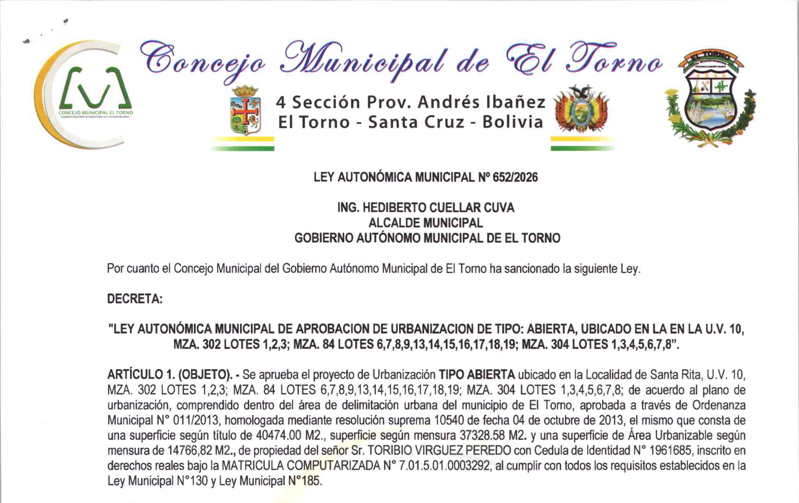 «LEY AUTONÓMICA MUNICIPAL DE APROBACION DE URBANIZACION DE TIPO: ABIERTA, UBICADO EN LA EN LA U.V. 10, MZA. 302 LOTES 1,2,3; MZA. 84 LOTES 6,7,8,9,13,14,15,16,17,18,19; MZA. 304 LOTES 1,3,4,5,6,7,8». ARTÍCULO 1. (OBJETO).- Se aprueba el proyecto de Urbanización TIPO ABIERTA ubicado en la Localidad de Santa Rita, U.V. 10, MZA. 302 LOTES 1,2,3; MZA. 84 LOTES 6,7,8,9,13,14,15,16,17,18,19; MZA.