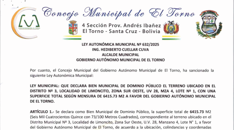 LEY MUNICIPAL: QUE DECLARA BIEN MUNICIPAL DE DOMINIO PÚBLICO EL TERRENO UBICADO EN EL DISTRITO No 3, LOCALIDAD DE LIMONCITO, ZONA SUR OESTE, UV 28, MZA 4, LOTE No 1, CON UNA SUPERFICIE TOTAL SEGÚN MENSURA DE 6415.73 M2 A FAVOR DEL GOBIERNO AUTÓNOMO MUNICIPAL DE EL TORNO.