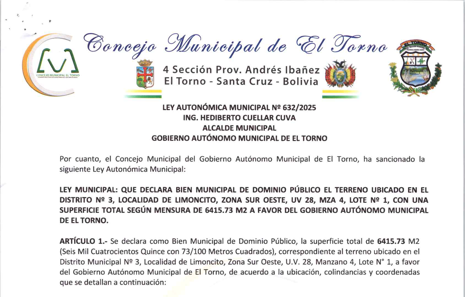 LEY MUNICIPAL: QUE DECLARA BIEN MUNICIPAL DE DOMINIO PÚBLICO EL TERRENO UBICADO EN EL DISTRITO No 3, LOCALIDAD DE LIMONCITO, ZONA SUR OESTE, UV 28, MZA 4, LOTE No 1, CON UNA SUPERFICIE TOTAL SEGÚN MENSURA DE 6415.73 M2 A FAVOR DEL GOBIERNO AUTÓNOMO MUNICIPAL DE EL TORNO.