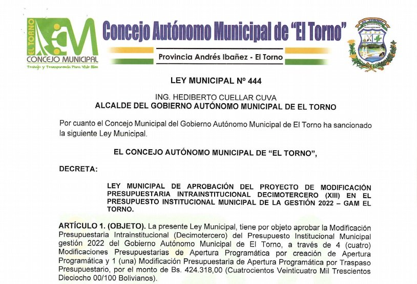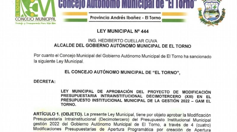 LEY MUNICIPAL DE APROBACIÓN DEL PROYECTO DE MODIFICACIÓN PRESUPUESTARIA INTRAINSTITUCIONAL DECIMOTERCERO (XIII) EN EL PRESUPUESTO INSTITUCIONAL MUNICIPAL DE LA GESTIÓN 2022 – GAM EL TORNO.