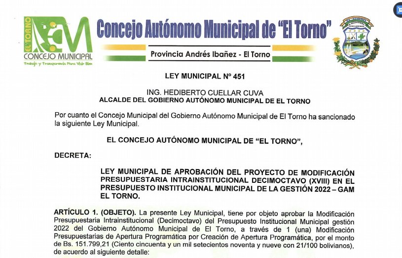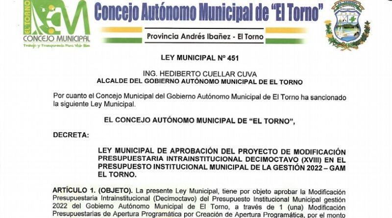 LEY MUNICIPAL DE APROBACIÓN DEL PROYECTO DE MODIFICACIÓN PRESUPUESTARIA INTRAINSTITUCIONAL DECIMOCTAVO (XVIII) EN EL PRESUPUESTO INSTITUCIONAL MUNICIPAL DE LA GESTIÓN 2022 – GAM EL TORNO.