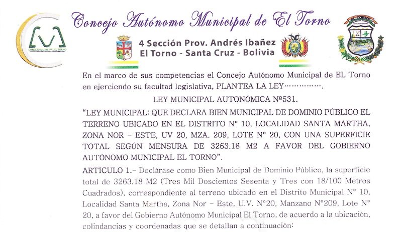 LEY MUNICIPAL AUTONÓMICA Nº 531.»LEY MUNICIPAL: QUE DECLARA BIEN MUNICIPAL DE DOMINIO PÚTBLICO ELTERRENO UBICADO EN EL DISTRITO N»10, LOCALIDAD SANTA MARTHA,ZONA NOR – ESTE, UV 20, MZA. 209, LOTE Nº 20, CON UNA SUPERFICIETOTAL SEGÚN MENSURA DE 3263.18 M2 A FAVOR DEL GOBIERNOAUTÓNOMO MUNICIPAL EL TORNO».