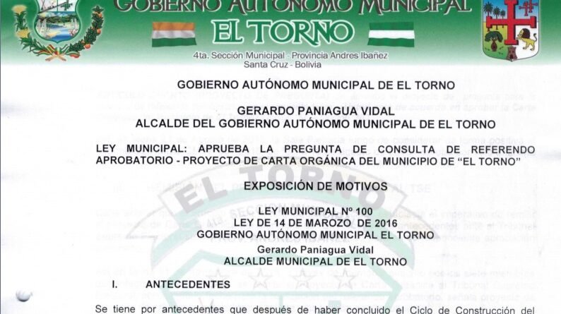 LEY MUNICIPAL: APRUEBA LA PREGUNTA DE CONSULTA DE REFERENDO APROBATORIO – PROYECTO DE CARTA ORGÁNICA DEL MUNICIPIO DE “EL TORNO”EXPOSICIÓN DE MOTIVOS