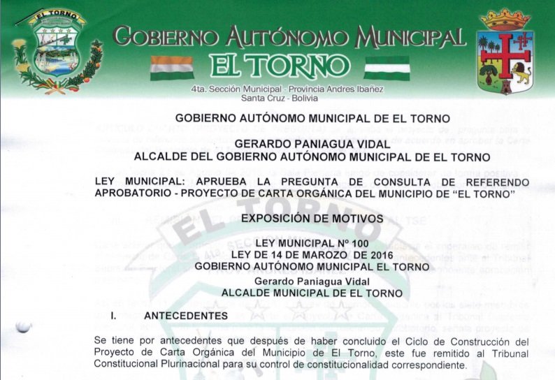 Proyecto de Carta Orgánica del Municipio de El Torno, este fue remitido al Tribunal Constitucional Plurinacional para su control de constitucionalidad correspondiente. En efecto, luego de que se hubiera observado en dos oportunidades el mencionado proyecto, a través de las Declaraciones Constitucionales Plurinacionales N° 0002/2015 de fecha 06 de enero de 2015 y N° 0115/2015 de fecha 07 de mayo de 2015, emitidas por el Tribunal Constitucional Plurinacional de Bolivia, se procedió a realizar y configurar el Texto Ordenado del Proyecto de Carta Orgánica del Municipio de El Torno, compatibilizado de manera plena a través de las dos Declaraciones Constitucionales citadas precedentemente, previa a la socialización y validación de la sistematización del Texto Ordenado del proyecto de Carta Orgánica Municipal.