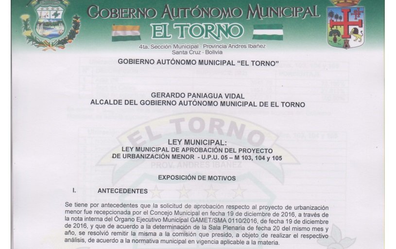 La Constitución Política del Estado, establece en su artículo 269 que Bolivia se organiza territorialmente en departamentos, provincias, municipios y territorios indígena originario campesinos». Por su parte el artículo 270 de la misma Carga Magna, refiere los principios que rigen la organización territorial y las entidades territoriales descentralizadas y autónomas como: /a unidad, voluntariedad, solidaridad, equidad, bien común, autogobierno, igualdad, complementariedad, reciprocidad, equidad de género subsidiariedad, gradualidad, coordinación y lealtad institucional, transparencia, participación y control social, provisión de recursos económicos y preexistencia de las naciones y pueblos indígena originario campesinos, en los términos establecidos en esta Constitución. De igual forma el artículo 302, parágrafo I, numeral 10 de la Constitución Política del Estado, indica que el Gobierno Municipal tiene competencia para administrar el Catastro urbano en el ámbito de su jurisdicción en conformidad a los preceptos y parámetros técnicos establecidos para los Gobiernos Municipales. El artículo 302, parágrafo I, numeral 6, de la misma Carta Magna, concordante con el parágrafo III, numerales 1 y 2 del artículo 94 de la Ley 031 Ley Marco de Autonomía y Descentralización facultan al Gobierno Autónomo Municipal aprobar el Plan Municipal de Ordenamiento Territorial, la asignación de uso de suelo, la determinación de patrones de asentamientos, normas de edificación, urbanización y fraccionamiento y áreas de grandes centros comerciales.