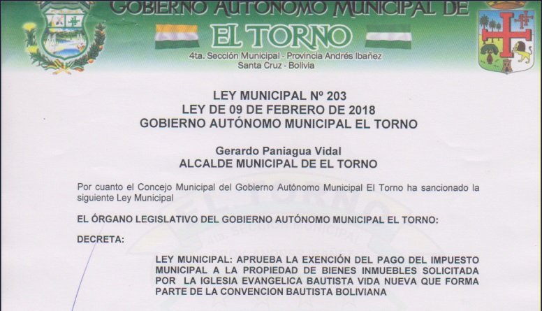 LEY MUNICIPAL: APRUEBA LA EXENCIÓN DEL PAGO DEL IMPUESTO MUNICIPAL A LA PROPIEDAD DE BIENES INMUEBLES SOLICITADA POR LA IGLESIA EVANGELICA BAUTISTA VIDA NUEVA QUE FORMA PARTE DE LA CONVENCION BAUTISTA BOLIVIANA