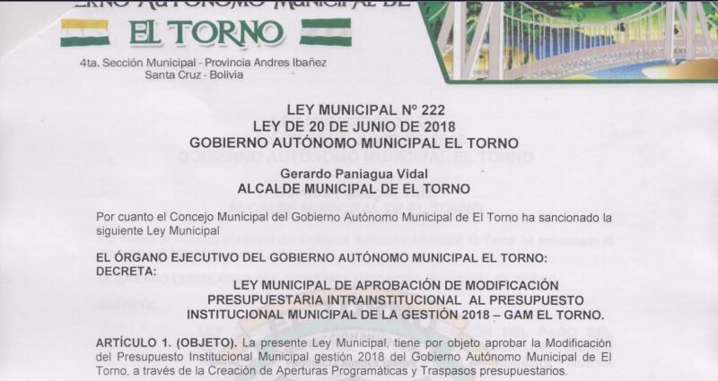 LEY MUNICIPAL DE APROBACIÓN DE MODIFICACIÓN PRESUPUESTARIA INTRAINSTITUCIONAL AL PRESUPUESTOINSTITUCIONAL MUNICIPAL DE LA GESTIÓN 2018 – GAM EL TORNO.