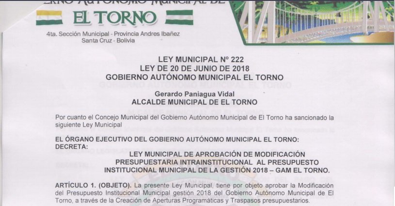 Por cuanto el Concejo Municipal del Gobierno Autónomo Municipal de El Torno ha sancionado la siguiente Ley Municipal