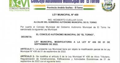 Por cuanto el Concejo Municipal del Gobierno Autónomo Municipal de El Torno ha sancionado la siguiente Ley Municipal