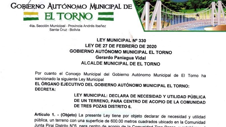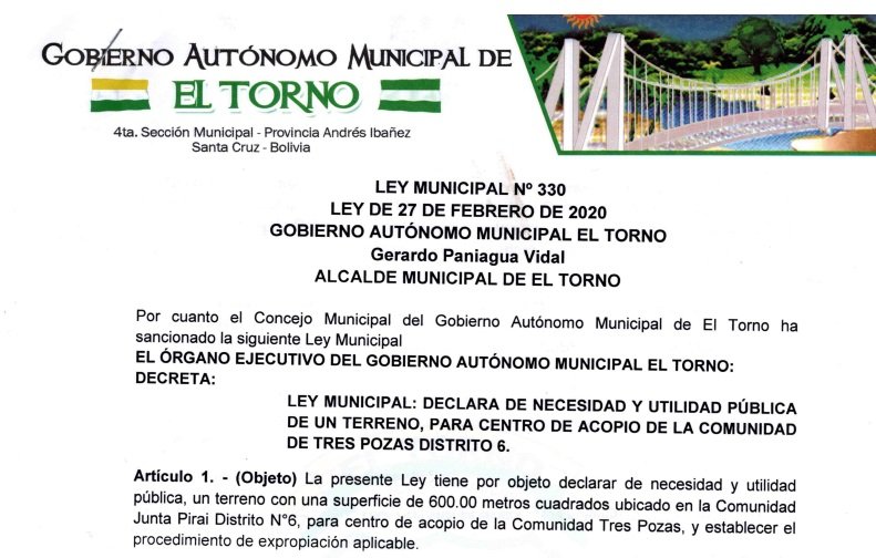 LEY MUNICIPAL: DECLARA DE NECESIDAD Y UTILIDAD PÚBLICA DE UN TERRENO, PARA CENTRO DE ACOPIO DE LA COMUNIDAD DE TRES POZAS DISTRITO 6.
