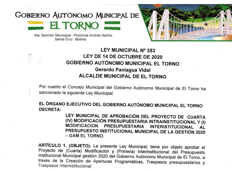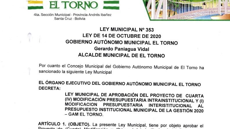 ARTÍCULO 1. (OBJETO). La presente Ley Municipal, tiene por objeto aprobar el Proyecto de (Cuarta) Modificación y (Primera) Interinstitucional del Presupuesto Institucional Municipal gestión 2020 del Gobierno Autónomo Municipal de El Torno, a través de la Creación de Aperturas Programáticas, Traspasos presupuestarios y Traspasos Interinstitucional.