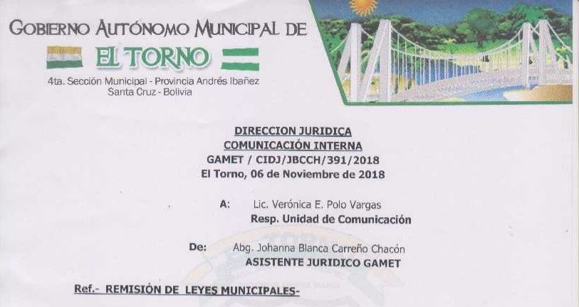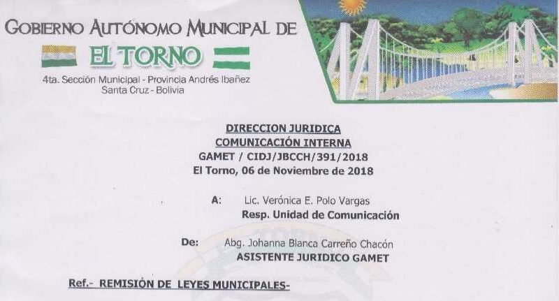 • LEY MUNICIPAL N° 249 DE APROBACIÓN DEL PROYECTO DE MODIFICACIÓN PRESUPUESTARIA (DECIMA) EN EL PRESUPUESTO INSTITUCIONAL MUNICIPAL DE LA GESTIÓN 2018 – GAM EL TORNO