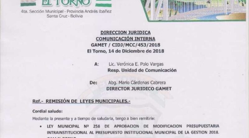 LEY MUNICIPAL N& 258 DE APROBACION DE MODIFICACION PRESUPUESTARIAINTRA INSTITUCIONAL AL PRESUPUESTO INSTITUCIONAL MUNICIPAL DE LA GESTION 2018. GAM ÉL TORNO.