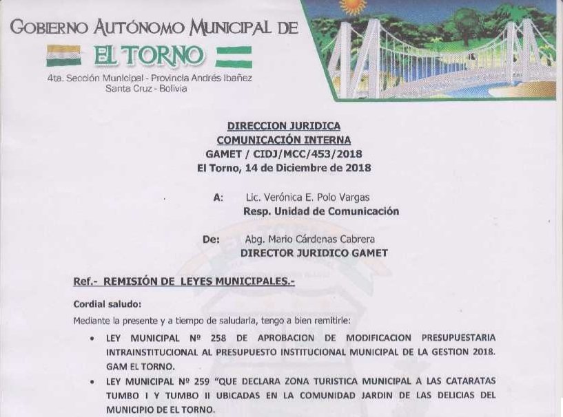 LEY MUNICIPAL N- 259 «QUE DECLARA ZONA TURISTICA MUNICIPAL A LAS CATARATAS TUMBO I V TUMBO II UBICADAS EN LA COMUNIDAD JARDIN DE LAS DELICIAS DEL MUNICIPIO DE EL TORNO.
