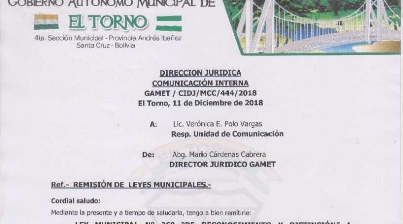 •LEY MUNICIPAL N° 260-A “DE RECONOCOCIMIENTO Y DISTINCIÓN” A OSCAR EDUARDO NAVIA ROCHA.