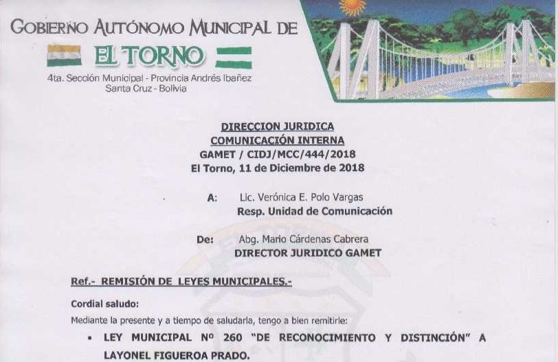 LEY MUNICIPAL No 260 DE RECONOCIMIENTO Y DISTINCIÓN A LAYONEL FIGUEROA PRADO