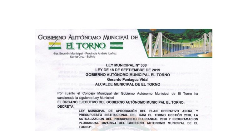 LEY MUNICIPAL DE APROBACIÓN DEL PLAN OPERATIVO ANUAL Y PRESUPUESTO INSTITUCIONAL DEL GAM EL TORNO GESTIÓN 2020, LA ACTUALIZACION DEL PRESUPUESTO PLURIANUAL 2020 Y PROGRAMACION PLURIANUAL 2021-2024 DEL GOBIERNO AUTONOMO MUNICIPAL DE EL TORNO”.