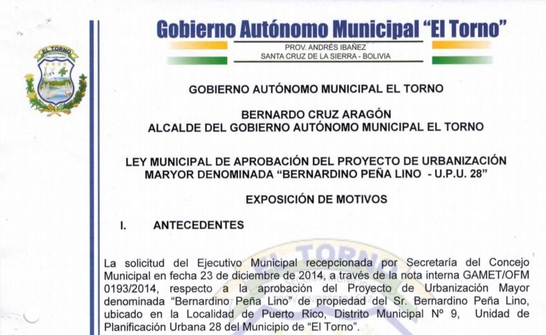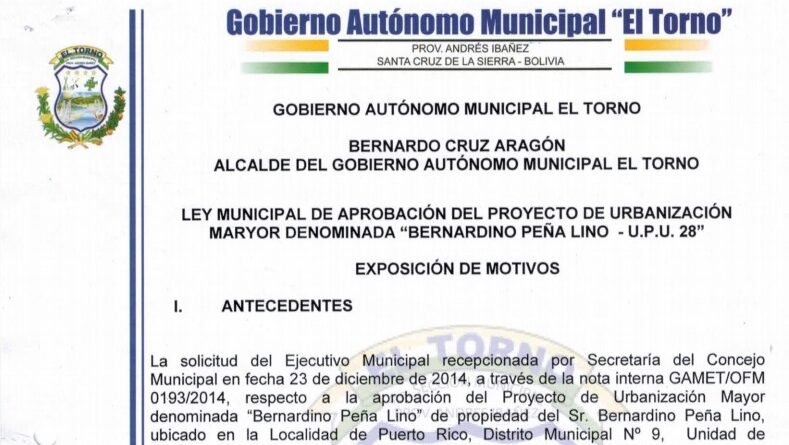 LEY MUNICIPAL DE APROBACIÓN DEL PROYECTO DE URBANIZACIÓN MARYOR DENOMINADA BERNARDINO PEÑA LINO – U.P.U. 28EXPOSICIÓN DE MOTIVOS