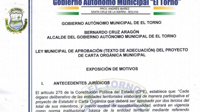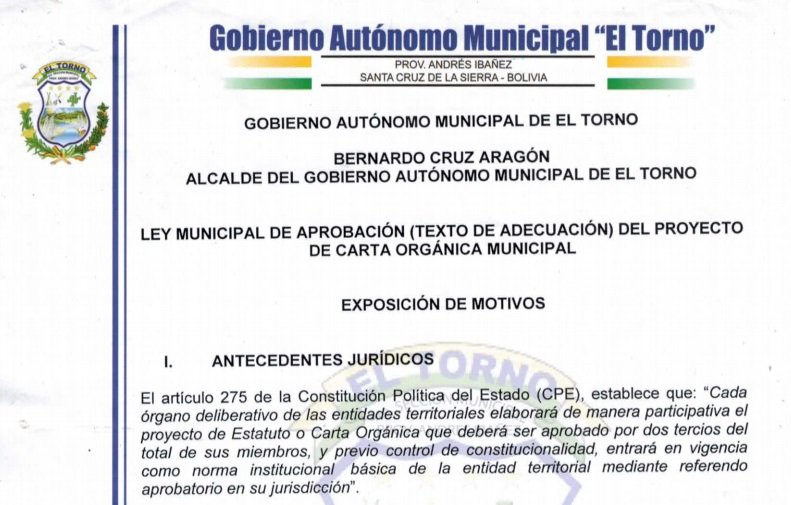 El artículo 275 de la Constitución Política del Estado (CPE), establece que: «Cada órgano deliberativo de las entidades territoriales elaborará de manera participativa el proyecto de Estatuto o Carta Orgánica que deberá ser aprobado por dos tercios del total de sus miembros, y previo control de constitucionalidad, entrará en vigencia como norma institucional básica de la entidad territorial mediante referendo aprobatorio en su jurisdicción».