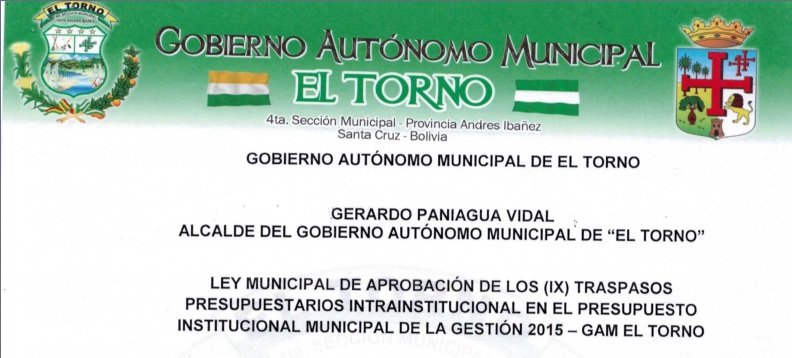 LEY MUNICIPAL DE APROBACIÓN DE LOS (IX) TRASPASOS PRESUPUESTARIOS INTRAINSTITUCIONAL EN EL PRESUPUESTO INSTITUCIONAL MUNICIPAL DE LA GESTIÓN 2015 – GAM EL TORNO