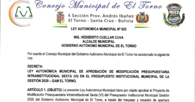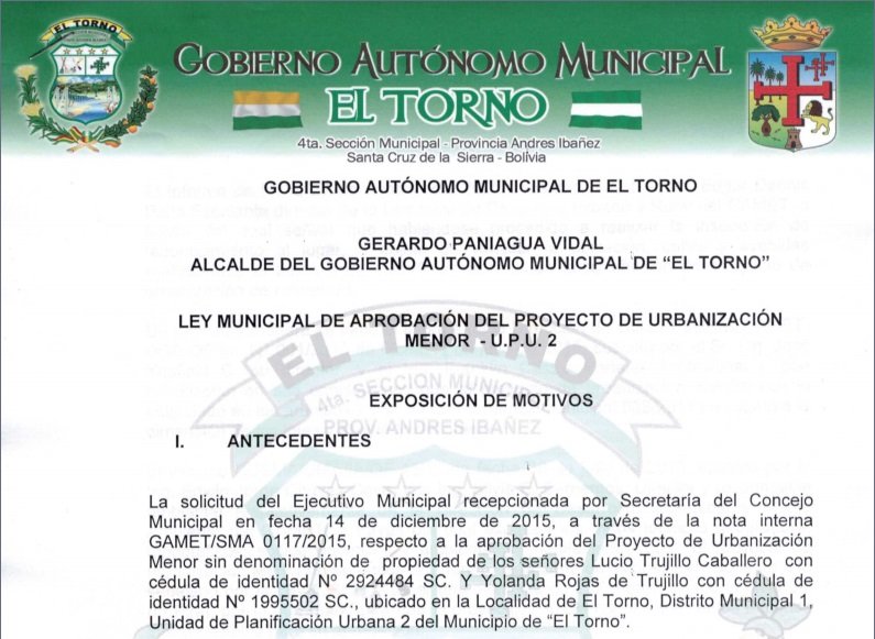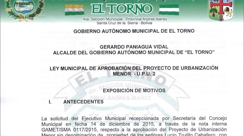 El crecimiento urbano del Municipio de El Torno, en el marco de una Planificación Estratégica, hace necesario plantear y definir la zonificación y usos de suelo de las diferentes áreas de terrenos en su extensión jurisdiccional bajo normas básicas, técnicas y administrativas para la formulación de esquemas de ordenamientos a corto, mediano y largo plazo. La urbanización es el proceso a través del cual se concentra y densifica un territorio, en forma planificada, dotándolo de vías de circulación, servicios públicos esenciales y de áreas de equipamiento, pudiendo estar contenida en toda o parte de una Unidad de Planificación Urbana. los señores Lucio Trujillo Caballero con cédula de identidad N° 2924484 SC. Y Yolanda Rojas de Trujillo con cédula de identidad N° 1995502 SC., son propietarios de los predios de la Urbanización Menor sin denominación, quien ha seguido los pasos técnicos y legales dentro del Proyecto de la mencionada Urbanización para su aprobación. El mencionado predio tiene como registro de inscripción en DDRR la matrícula 7.01.4.01.0007748, vigente de fecha 09-02-2015 y como código Catastral N° 7050027770042, ubicado en la Localidad de El Torno, UV 2 (Manzanos 12 [1, 2, 3, 4 y 5] 13 (1, 2, 3, 4 y 5] de acuerdo al plano de urbanización) a favor de los señores Lucio Trujillo Caballero y Yolanda Rojas de Trujillo, Jurisdicción Municipal de El Torno», Prov. Andrés Ibáñez del Departamento de Santa Cruz.
