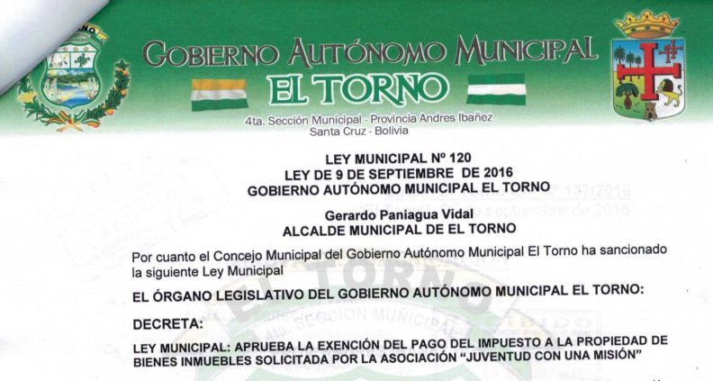 Artículo 1o.- (Objeto) La presente Ley Municipal tiene por objeto aprobar la solicitud de exención del Pago de Impuesto a la Propiedad de Bienes Inmuebles Urbano (IPBI) correspondiente a las gestiones fiscales 2014 y 2015, del inmueble de propiedad de la Asociación Juventud con una Misión», ubicado dentro de la Jurisdicción Territorial del Municipio de El Torno».