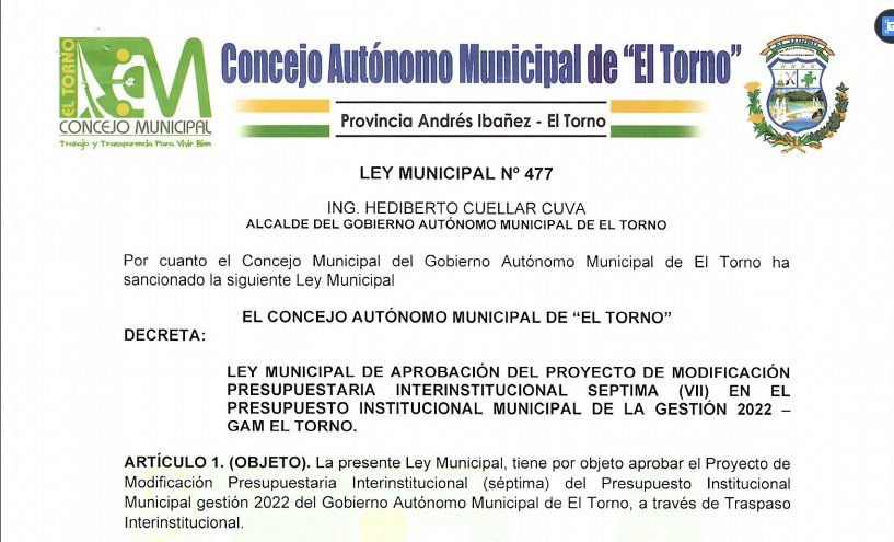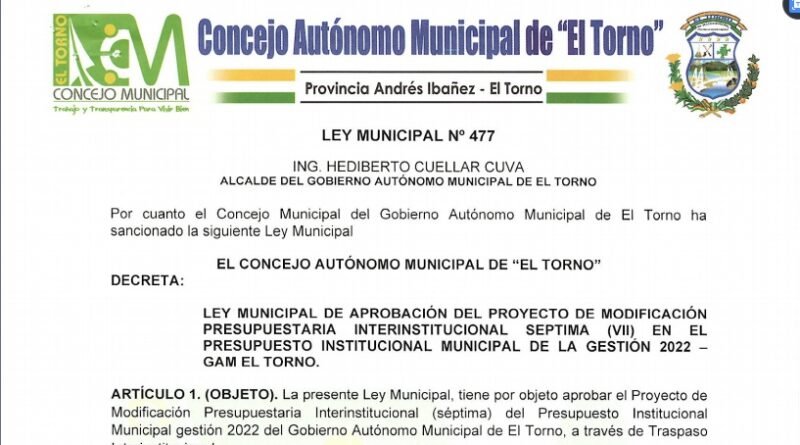 LEY MUNICIPAL DE APROBACIÓN DEL PROYECTO DE MODIFICACIÓN PRESUPUESTARIA INTERINSTITUCIONAL SEPTIMA (Vll) EN EL PRESUPUESTO INSTITUCIONAL MUNICIPAL DE LA GESTIÓN 2022 – GAM EL TORNO.