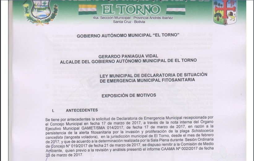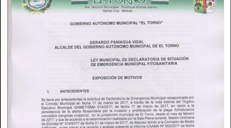 Se tiene por antecedentes la solicitud de Declaratoria de Emergencia Municipal recepcionada por el Concejo Municipal en fecha 17 de marzo de 2017, a través de la nota interna del Órgano Ejecutivo Municipal GAMET/SMA 014/2017, de fecha 17 de marzo de 2017, en razón a la persistencia de la alerta fitosanitaria por la invasión y proliferación de la plaga Schistocerca cancellata (langosta voladora), en la jurisdicción municipal de El Torno, desde el mes de febrero de 2 7, y que de acuerdo a la determinación realizada por la Sala Plena durante Sesión Ordinaria de (Concejo N° 019/2017 de fecha 21 de marzo de 2017, se dispuso remitir a la Comisión de Medio Ambiente, quien previo a la revisión y análisis presentó el informe CAAMA N° 002/2017 de fechade marzo de 2017.