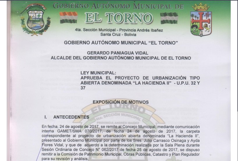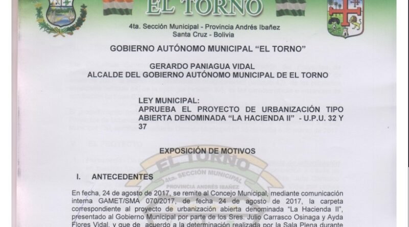 En fecha, 24 de agosto de 2017, se remite al Concejo Municipal, mediante comunicación interna GAMET/SMA 070/2017, de fecha 24 de agosto de 2017, la carpeta correspondiente al proyecto de urbanización abierta denominada La Hacienda II, presentado al Gobierno Municipal por parte de los Sres. Julio Carrasco Osinaga y Aydalores Vidal, y que de acuerdo a la determinación realizada por la Sala Plena durante Sesión Ordinaria de Concejo N° 062/2017 de fecha 25 de agosto de 2017, se dispuso remitir a la Comisión de Patrimonio Municipal, Obras Públicas, Catastro y Plan Regulador para su revisión y análisis.
