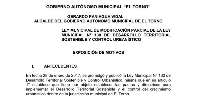 En fecha 28 de enero de 2017, se promulgó y publicó la Ley Municipal N° 130 de Desarrollo Territorial Sostenible y Control Urbanístico, misma que en su artículo 1 o establece que tiene por objeto establecer las pautas y directrices para implementar el Desarrollo Territorial Sostenible y el control del crecimiento urbanístico dentro de la jurisdicción municipal de El Torno.