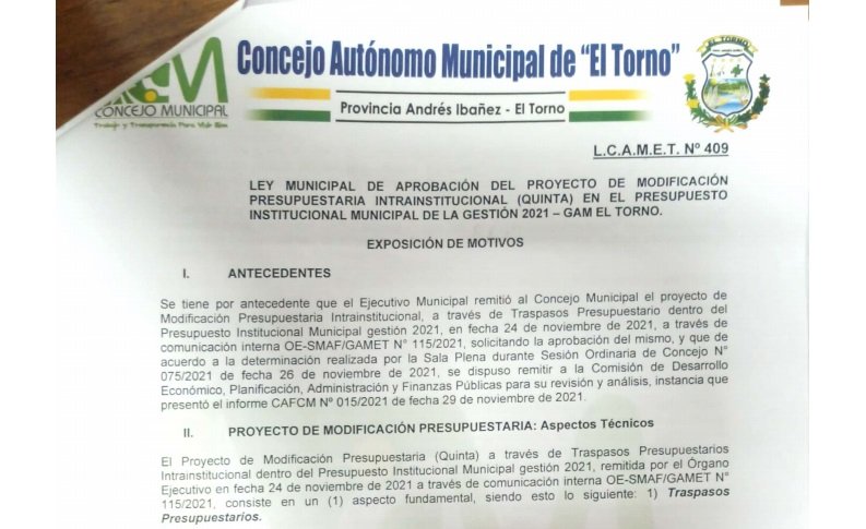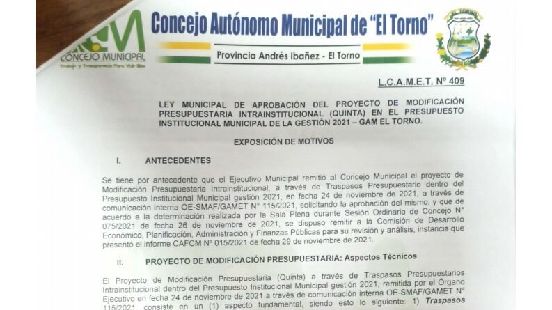 Se tiene por antecedente que el Ejecutivo Municipal remitió al Concejo Municipal el proyecto de Modificación Presupuestaria Intrainstitucional, a través de Traspasos Presupuestario dentro del Presupuesto Institucional Municipal gestión 2021. en fecha 24 de noviembre de 2021, a través de comunicación interna OE-SMAF/GAMET N° 115/2021, solicitando la aprobación del mismo, y que de acuerdo a la determinación realizada por la Sala Plena durante Sesión Ordinaria de Concejo N° 075/2021 de fecha 26 de noviembre de 2021, se dispuso remitir a la Comisión de Desarrollo Económico, Planificación, Administración y Finanzas Públicas para su revisión y análisis, instancia que presentó el informe CAFCM N° 015/2021 de fecha 29 de noviembre de 2021