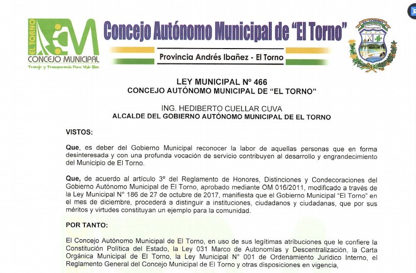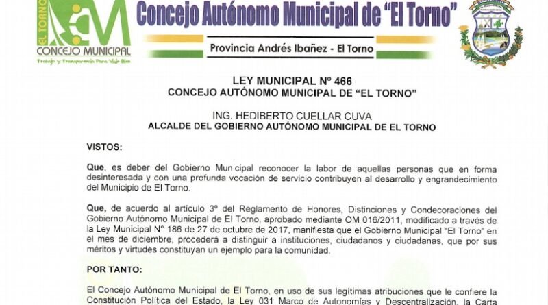 Que, de acuerdo al artículo 3o del Reglamento de Honores, Distinciones y Condecoraciones del Gobierno Autónomo Municipal de El Torno, aprobado mediante OM 016/2011, modificado a través de la Ley Municipal N° 186 de 27 de octubre de 2017, manifiesta que el Gobierno Municipal El Torno en el mes de diciembre, procederá a distinguir a instituciones, ciudadanos y ciudadanas, que por sus méritos y virtudes constituyan un ejemplo para la comunidad.