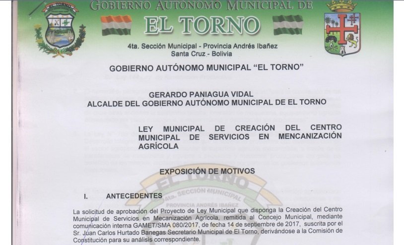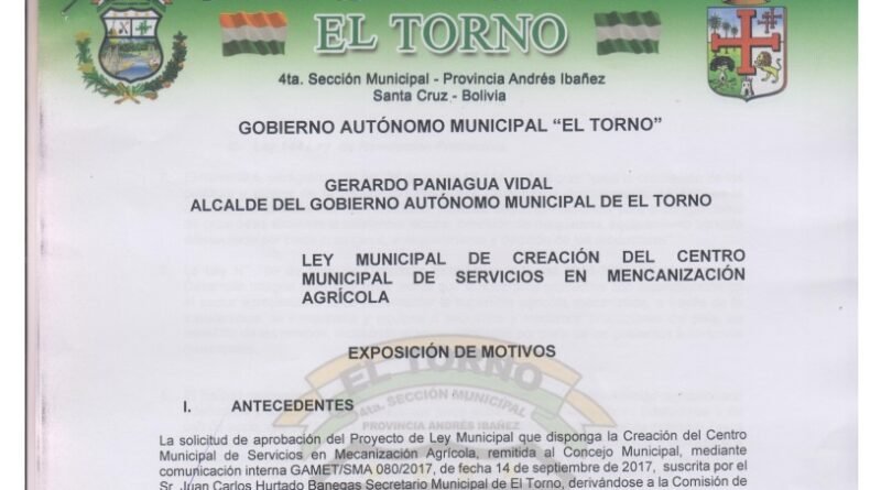 La solicitud de aprobación del Proyecto de Ley Municipal que disponga la Creación del Centro Municipal de Servicios en Mecanización Agrícola, remitida al Concejo Municipal, mediante comunicación interna GAMET/SMA 080/2017, de fecha 14 de septiembre de 2017, suscrita por el Sr. Juan Carlos Hurtado Banegas Secretario Municipal de El Torno, derivándose a la Comisión de Constitución para su análisis correspondiente.