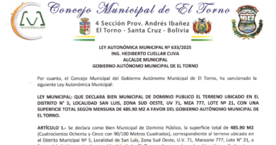 Por cuanto el Concejo Municipal del Gobierno Autónomo Municipal de El Torno ha sancionado la siguiente Ley Municipal